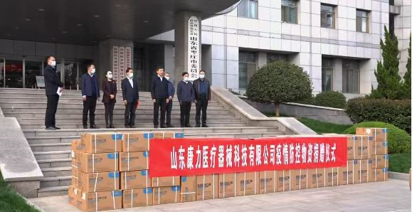 捐贈儀式上,山東康力醫(yī)療器械科技有限公司通過市紅十字會,定向捐贈了N95口罩2萬只、醫(yī)用外科口罩10萬只以及防護服2000套,并在第一時間運送到了抗疫一線。