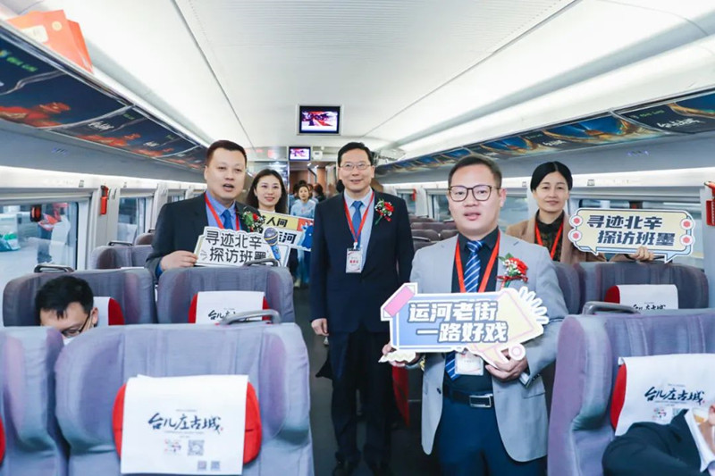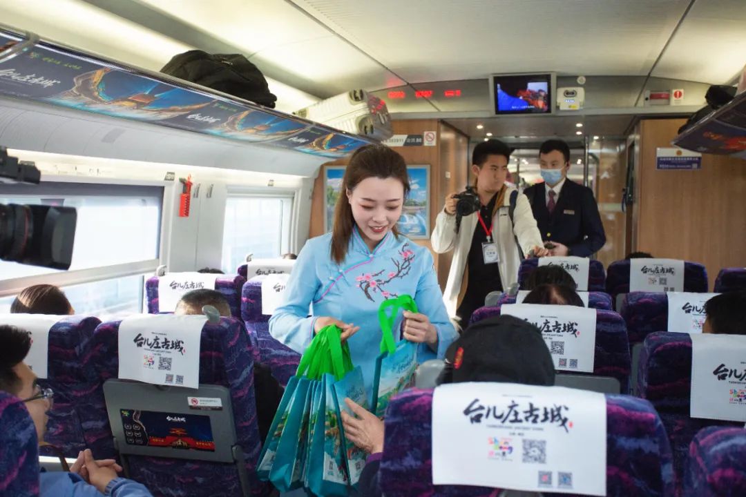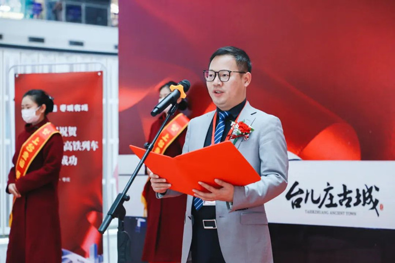 隨后,出席嘉賓共同為“臺兒莊古城”高鐵冠名專列首發(fā)啟程進行剪彩并互贈紀念品。